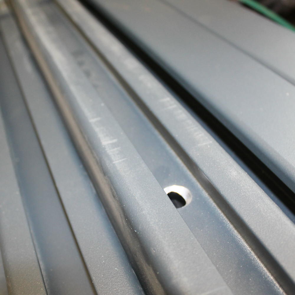 Pfosten vorbereitet für Bodenplatten (Bohrungen im Nutprofil)