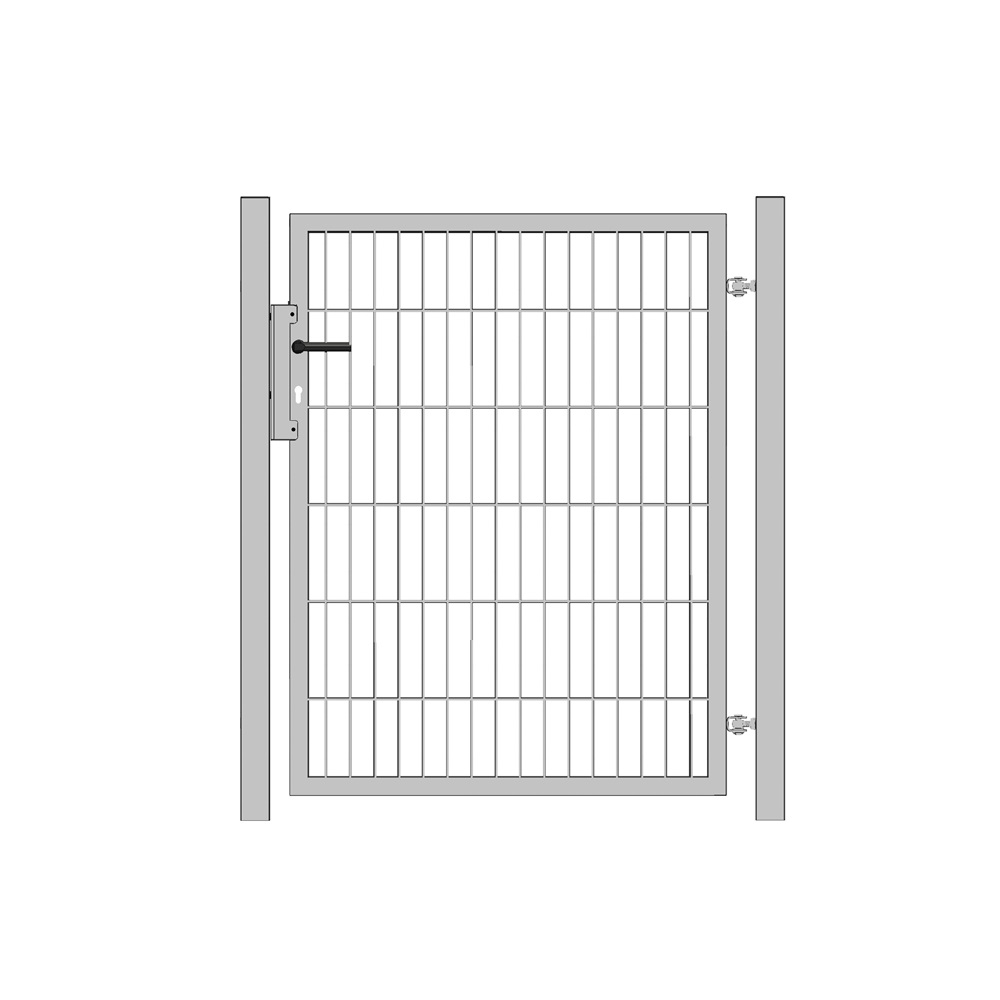 Alle einflügeligen Toranlagen werden mit den entsprechenden Torbändern, beidseitigem Zaunanschluss, einem Einsteckschloss für PZ vorbereitet mit Anschlag und einer Drückergarnitur geliefert. Die zweiflügeligen Toranlagen beinhalten außerdem noch zwei Torfeststeller und einen Mittelfeststeller mit Bodenhülse.