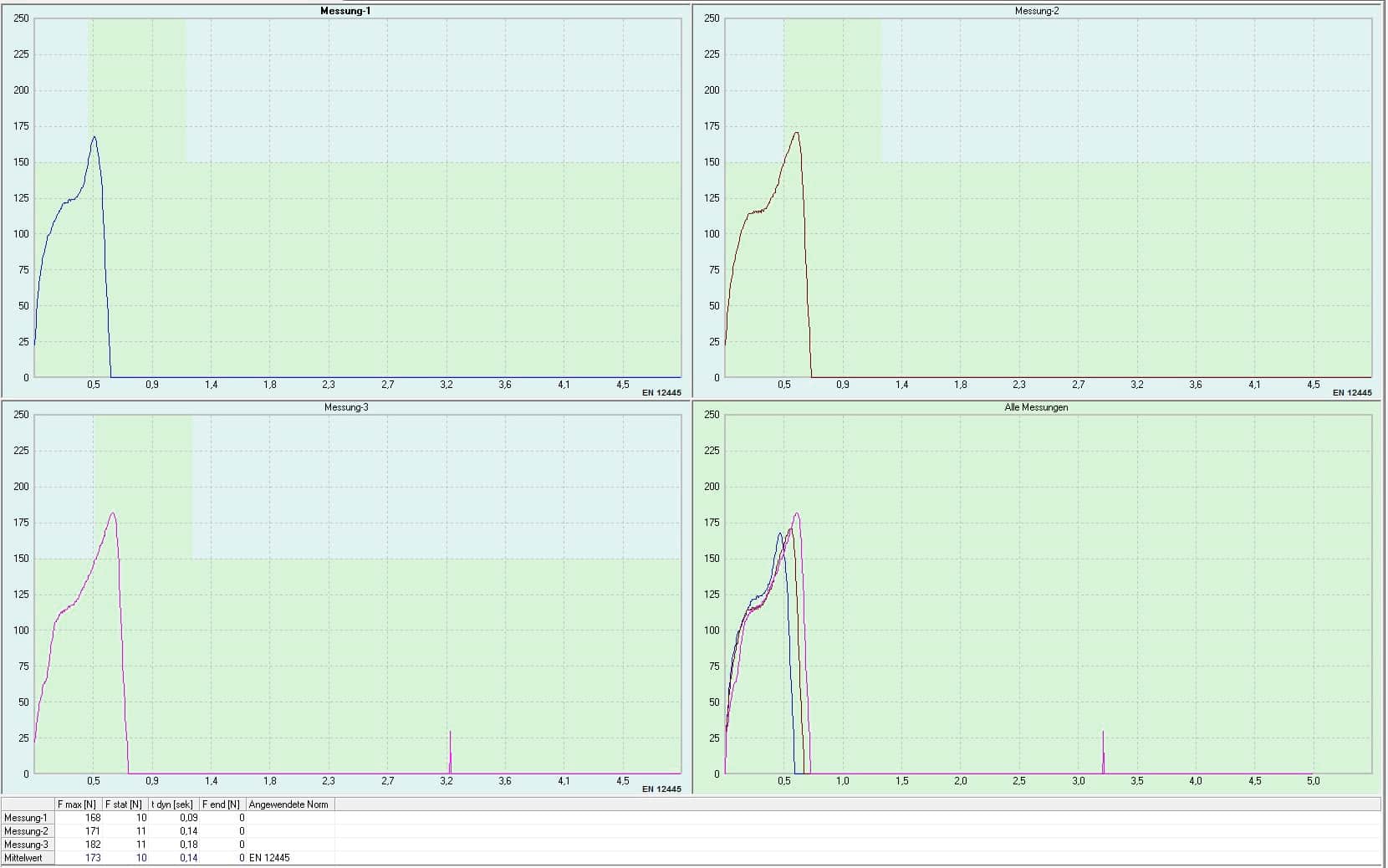 Bei der Überprüfung Ihrer kraftbetätigten Türen, Tore und Schranken, durch uns, führen wir auch eine Kraftmessung durch. An jedem nach der Norm festgelegten Messpunkt werden 3 Messungen vorgenommen. Hierbei stellen wir den Mittelwert dieser drei Messungen in N fest. Weiter überprüfen wir ob die max. Betriebskraft von 400N eingehalten wird. Ebenso überprüfen wir die dynamische Zeit von max 0,75s. Zum guten Schluss wird auch die Restkraft der Anlage nach 5s gemessen, welche dann nur noch bei kleiner 25N liegen darf.