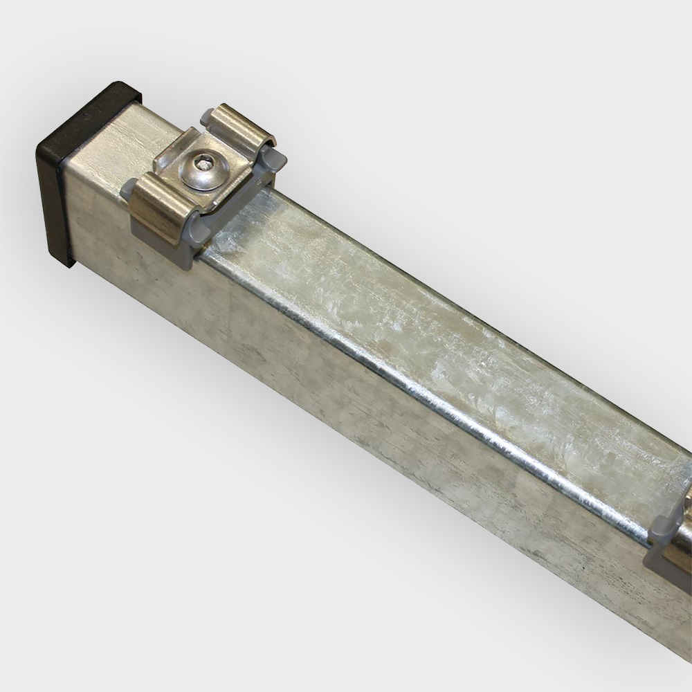 Rechteckprofilpfosten 60 x 40 mm mit Kunststoffgeräuschdämmern, Innensechskantschrauben und Edelstahlklemmelementen für die Gitteraufnahme. Pfosten mit Kunststoff-Abdeckkappe.