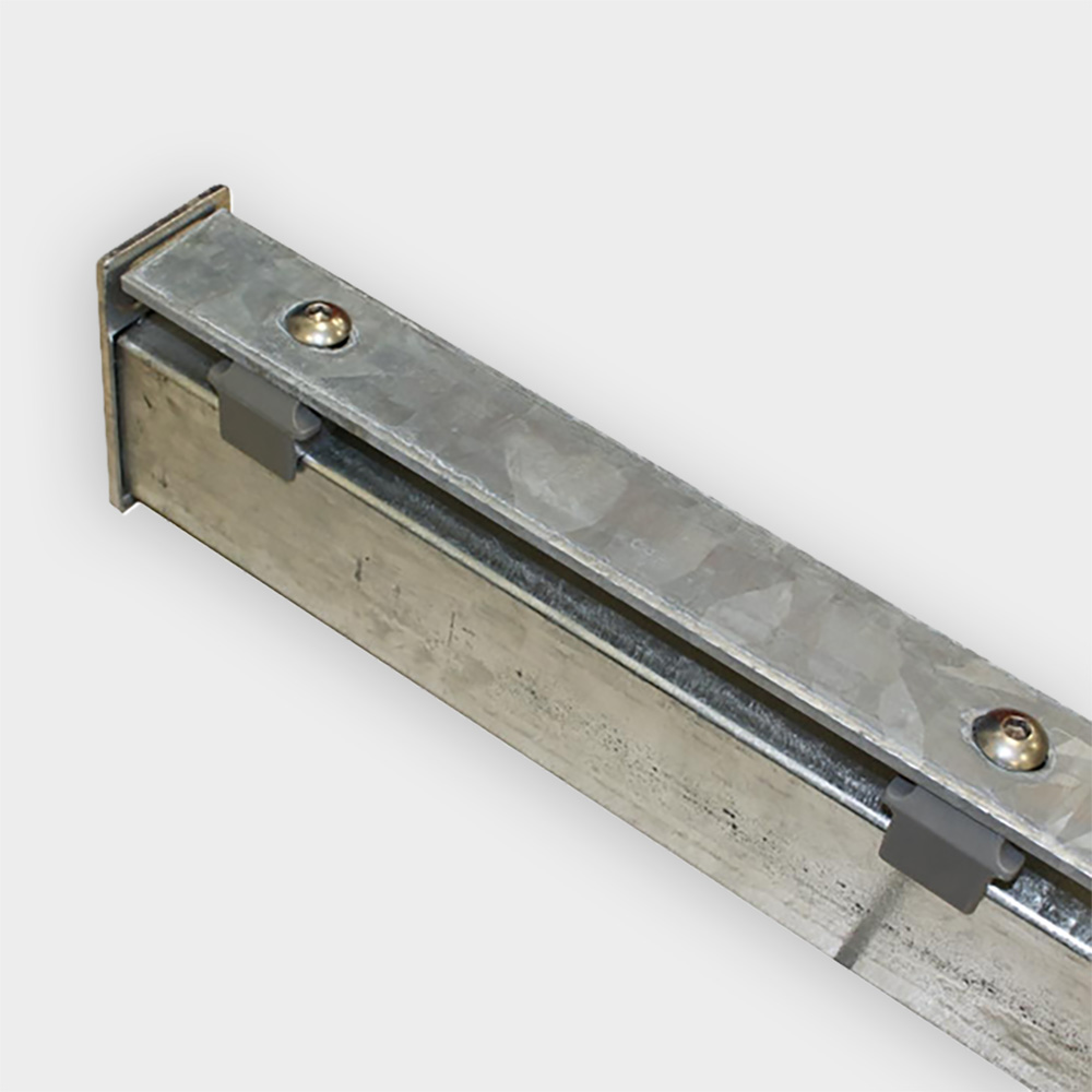Rechteckprofilpfosten 60 x 40 mm mit Kunststoffgeräuschdämmern, Innensechskantschrauben und einer durchgehenden verzinkten Abdeckleiste für die Gitteraufnahme. Pfosten mit stabiler Aluminium-Abdeckkappe.