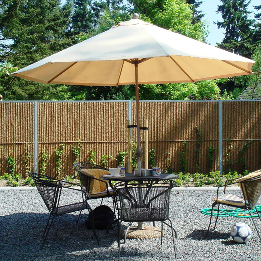 GardenWall® besteht aus fertigen Sichtschutzelementen, die zwischen stabilen Stahlträger-Pfosten montiert werden. Eine Reihe sicher fixierte Recyclingkunststoffrohre (Ø 32 mm) sind mit natürlichen Kokosfasern fest ummantelt.